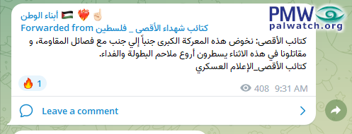 Posted text: “The Al-Aqsa [Martyrs’] Brigades (i.e., Fatah’s military wing): We are fighting in this great battle (i.e., Hamas’ terror war on Israel) together with the resistance factions, and our fighters are currently recording spectacular epics of heroism and sacrifice.