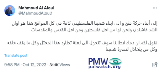Already three days after Hamas’ massacre, Al-Aloul stressed that the PA and Fatah should join Hamas: