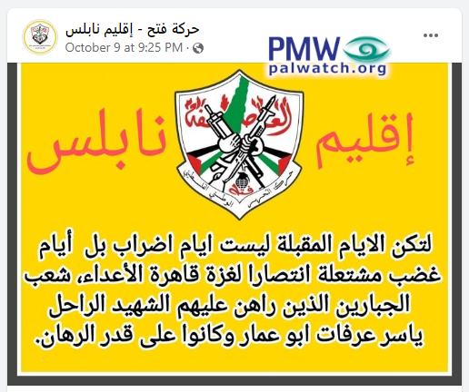 [Fatah Movement – Nablus Branch, Facebook page, Oct. 9, 2023]