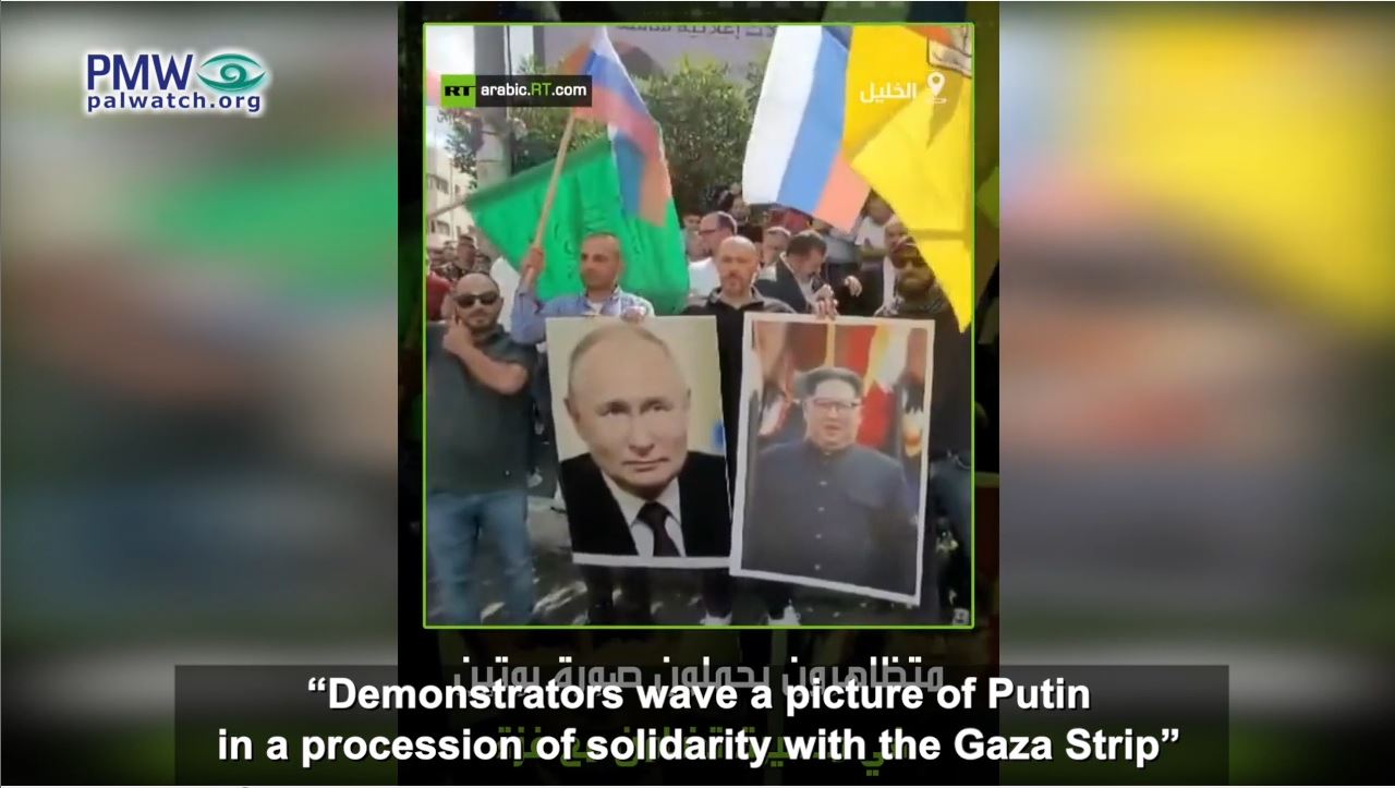 The video shows Palestinians at a demonstration in Hebron in support of Hamas’ terror war and massacre in Israel. One protester is holding pictures of Russian President Vladimir Putin and Supreme Leader of North Korea Kim Jong-un, others are waving Russian flags and a green Hamas flag: