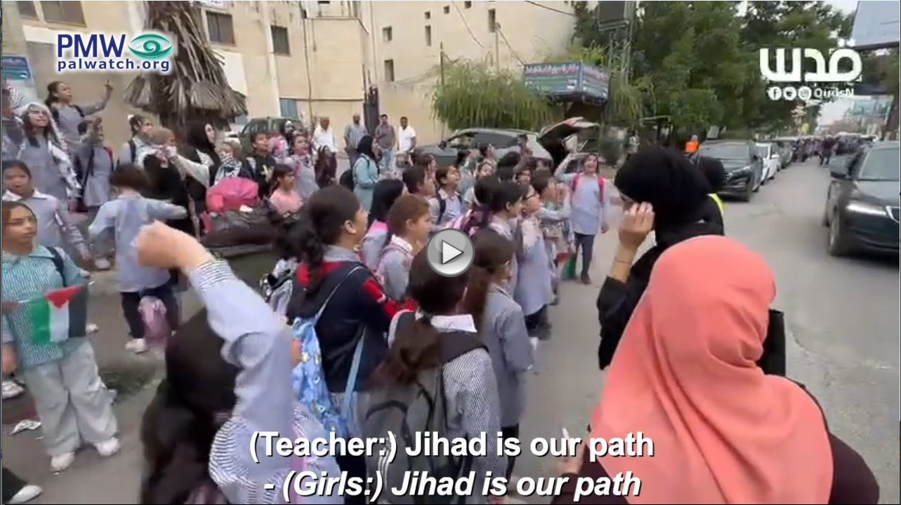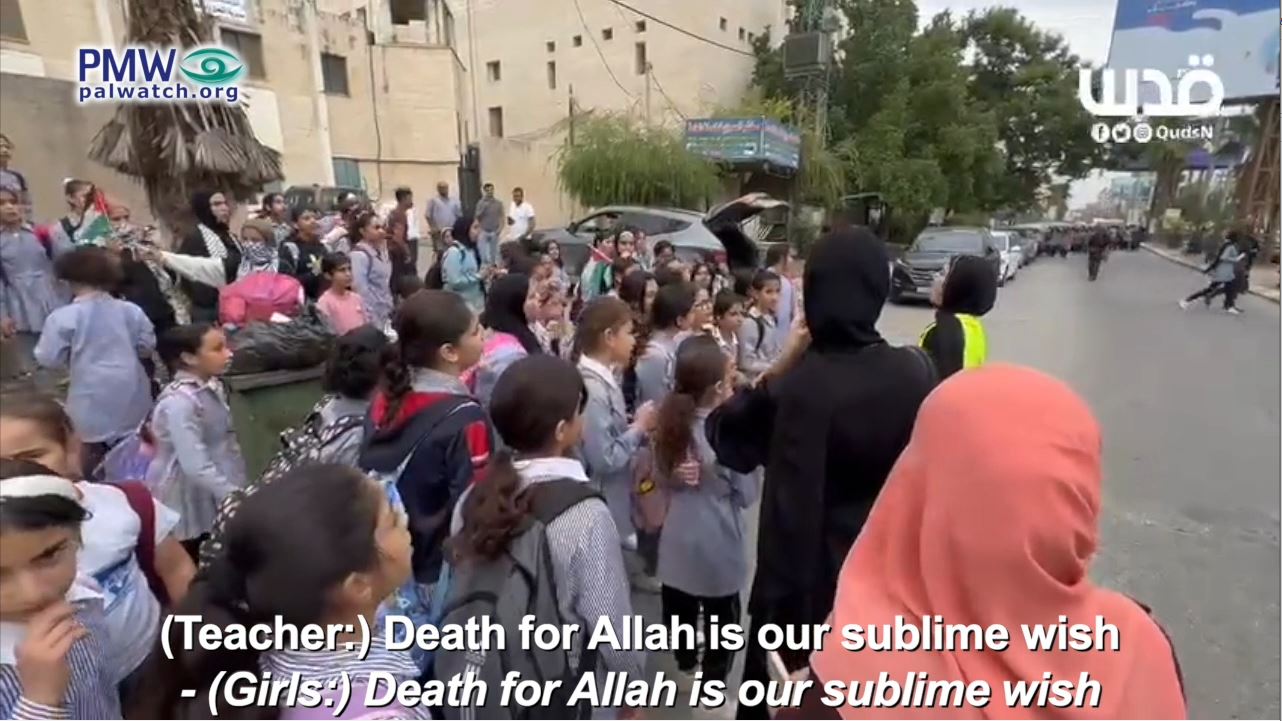 As expressions of support for Hamas continue on the West Bank, a teacher arranged young schoolgirls in rows outside a school and shouted slogans in support of Hamas’ terror waragainst Israel that the young students repeated.