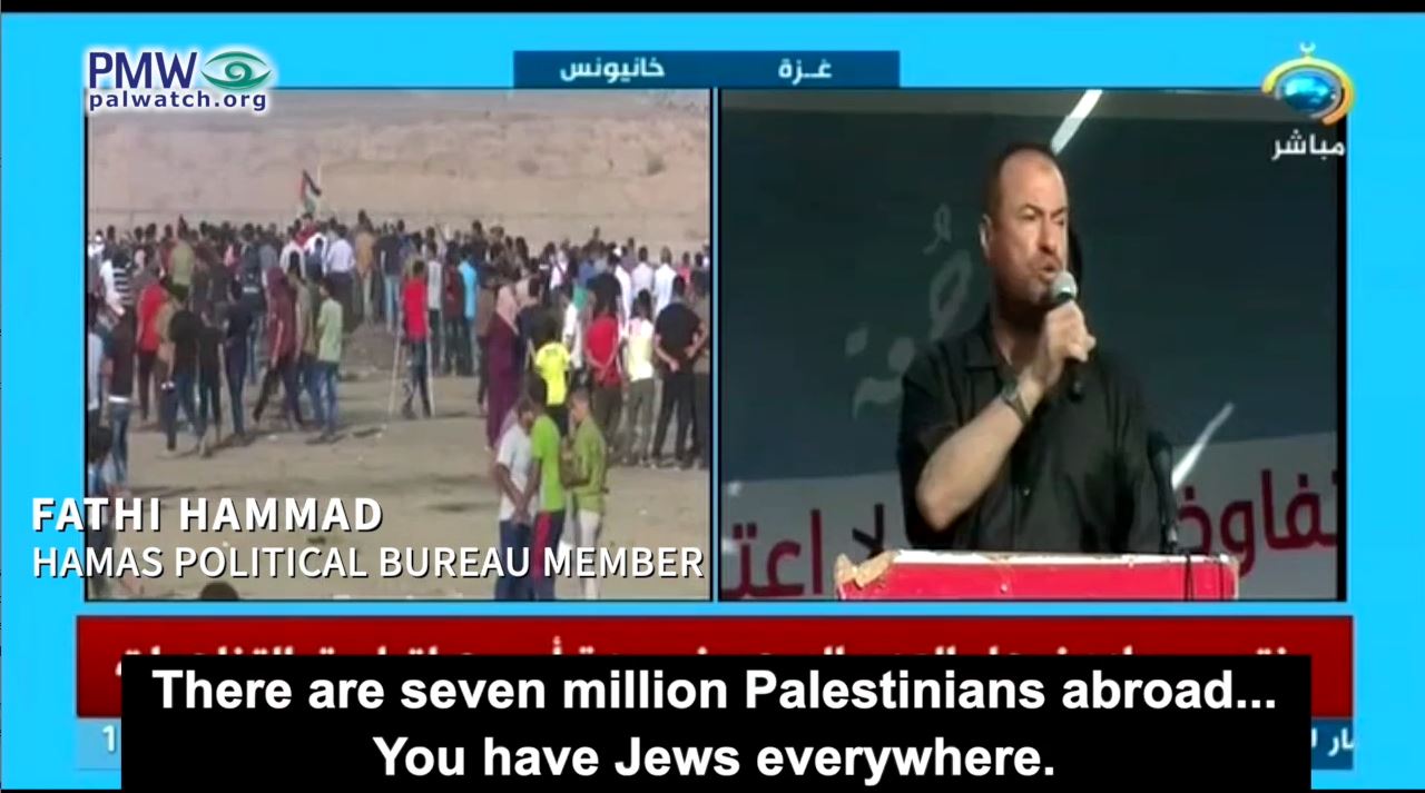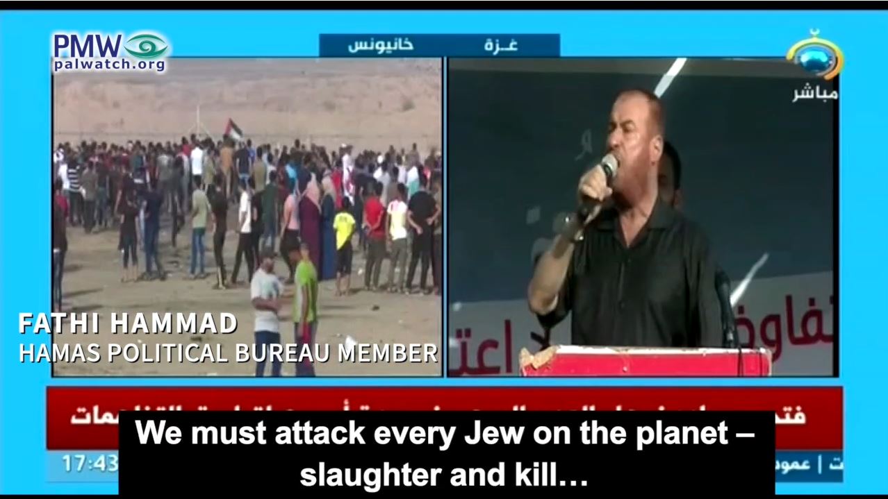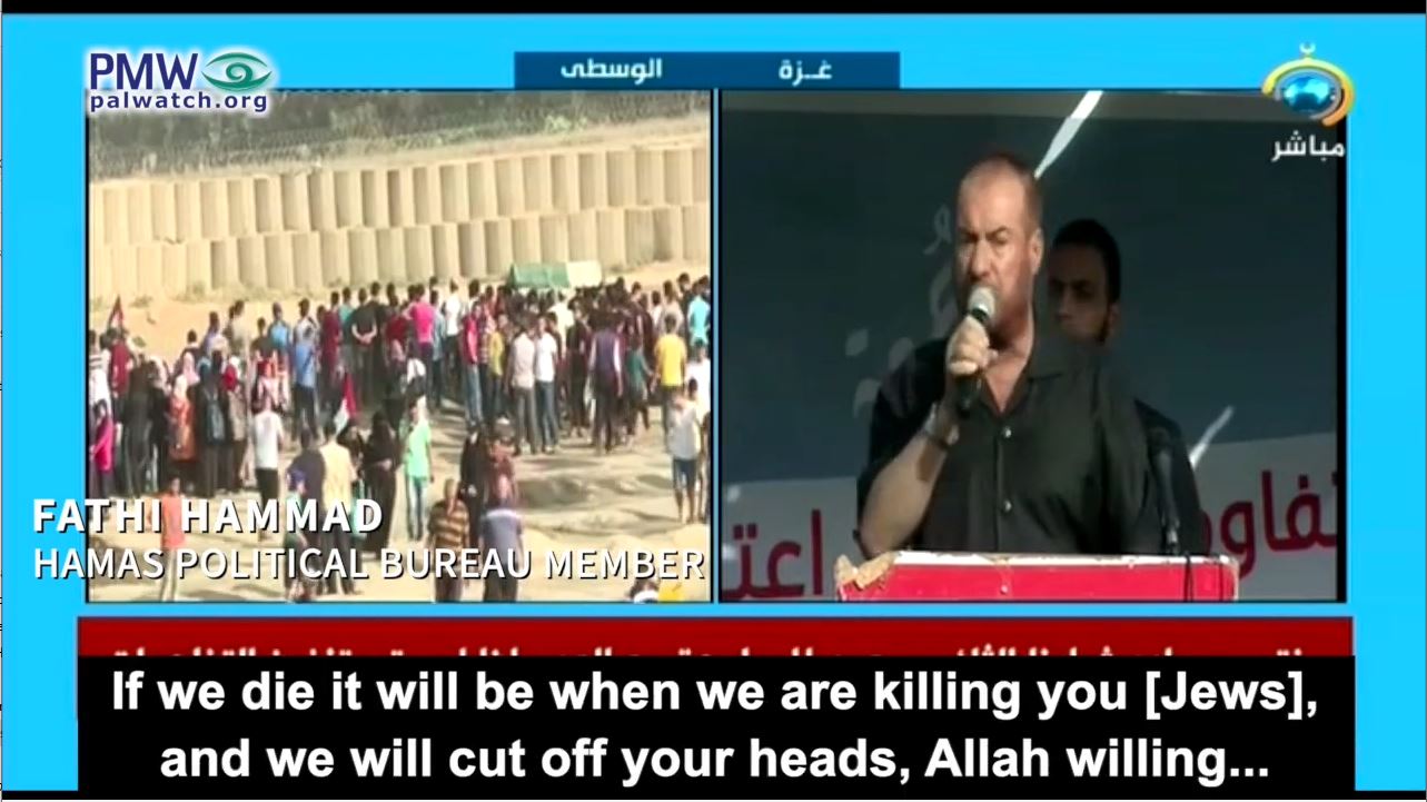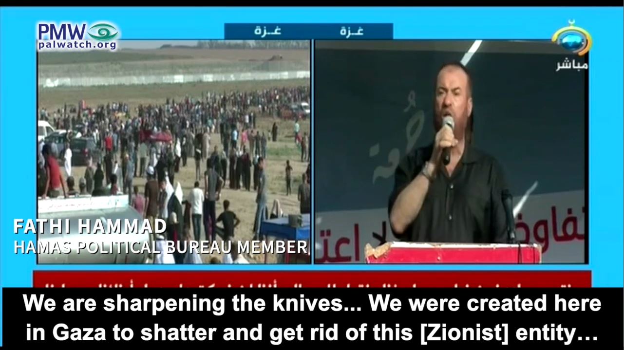 Hamas Political Bureau member Fathi Hammad: “We are sharpening the knives... We were created here in Gaza to shatter and get rid of this [Zionist] entity… If we die it will be when we are killing you [Jews], and we will cut off your heads, Allah willing... There are seven million Palestinians abroad... You have Jews everywhere. We must attack every Jew on the planet – slaughter and kill… And you, the people of the West Bank... We want the knives to come out. Five shekels [for a knife] – isn't the throat of a Jew worth five shekels to us? … I will die as I blow up and cut – what? The throats of the Jews and their legs. We will tear them to shreds, Allah willing.”