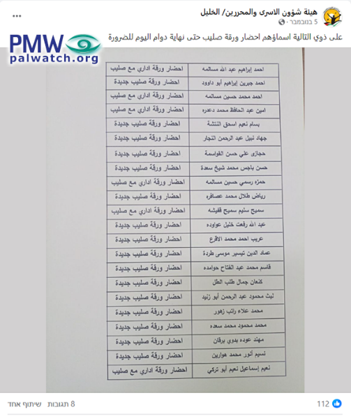 [PLO Commission of Prisoners’ Affairs – Hebron Directorate, Facebook page, Nov. 26, 2023]