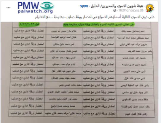 The pictures show a list of prisoners from the PA’s Hebron District whose period of eligibility to PA terror salaries ends in December 2023. Next to the prisoners’ names is written either “Bring a new [International Red] Cross document” or “Bring an administrative [detention] document with the [International Red] Cross’ [signature]”