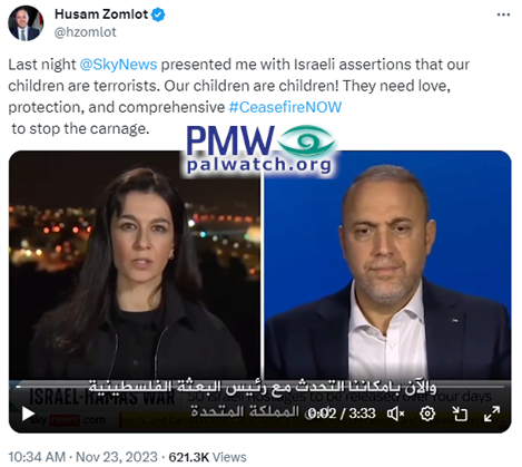 Sky News interviewer: “Mr. Zomlot, I just want to ask you on that point that you've just made about the Palestinian prisoners, because there is an expectation that 150 Palestinian women and children will also be released from Israeli prisons. The Israelis say that some of the people, some of the women and children in that group, are terrorists. How do you react and respond to that?”