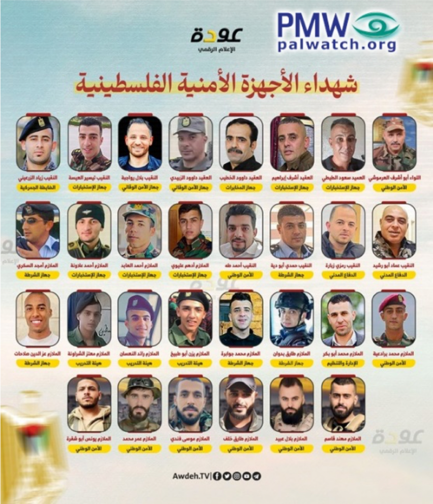 Fatah in August published a poster featuring 30 "Martyrs of the Palestinian Security Forces." Palestinian Media Watch found that 23 of the listed PA security officers died after carrying out attacks on Israelis. One of the men, Daoud al-Khatib, a colonel in the PA’s General Intelligence Services, served 18 years in Israeli prison for planting an explosive device and national security crimes, according to the Prison Service.