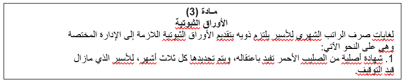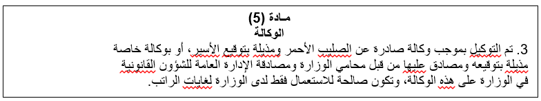 Clause 5 – Power of Attorney: (3) The authorization of a representative is executed through a power of attorney issued by the Red Cross signed by the prisoner, or through a personal power of attorney signed by him and certified by a lawyer of the Ministry and by the General Administration for Legal Matters of the Ministry. The document will be valid only at the Ministry for the purpose of paying the salaries.