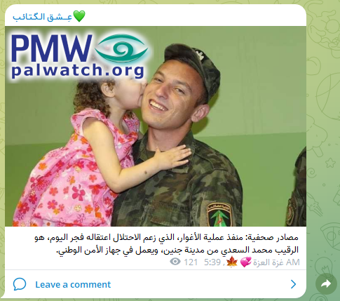 Corroborating that is also a post on the Telegram channel “Love of the Battalions” on April 1, 2024 featuring Al-Saadi in the uniform of the Palestinian Security Forces and saying that he was the one arrested for the attack.