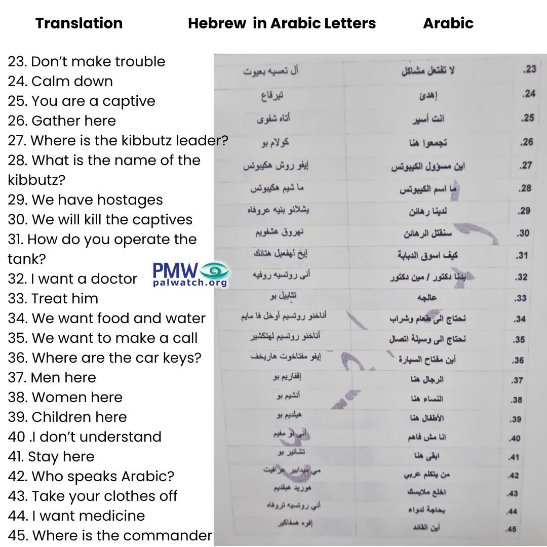 The Hamas language guide had the terms written in Arabic and their Hebrew translation then transliterated back into Arabic characters (see below) so that the terrorists would know how to speak and pronounce commands to the abducted Israelis.