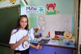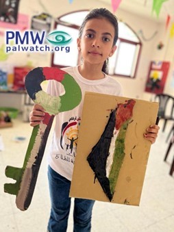 The image shows a child holding a drawing of the PA map of “Palestine” that presents all of Israel together with the PA areas as “Palestine” in the colors of the Palestinian flag. In her other hand, the child is holding a large key in the colors of the Palestinian flag, representing the Palestinian refugees’ “right of return.”
