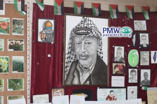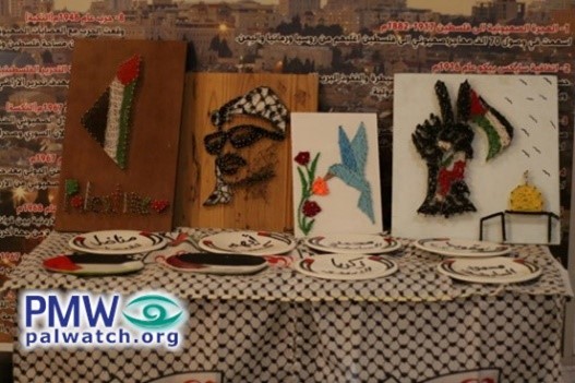 The photo shows an art display at one of the summer camps. In the upper left is a drawing of a man with the Dome of the Rock in place of his head, which is covered by a keffiyeh (Arab headdress); the man is holding a rock to throw it. In the center is a drawing of former PLO and PA Chairman Yasser Arafat, and on the right are several drawings of the PA map of “Palestine” that presents all of Israel together with the PA areas as “Palestine.” Also on the right are drawings of the six terrorist prisoners who temporarily escaped Gilboa Prison in 2021 – see note below. In the middle of the drawings of the terrorists is a drawing of the number “6” with the PA map of “Palestine” in the middle of it, indicating the six terrorists.