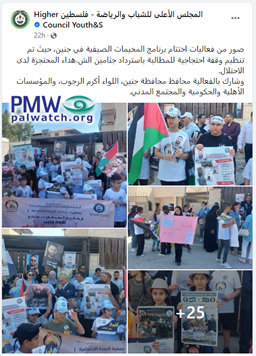 Posted text: “Pictures from the activities of the end of the [PLO Supreme Council for Youth and Sports] summer camp program in Jenin, as part of which a protest vigil was held demanding to return the Martyrs’ bodies that are being held by the occupation. Jenin District Governor Akram Rajoub participated in the activity.”