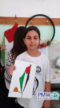 The picture shows a child holding a drawing of the PA map of “Palestine” that presents all of Israel together with the PA areas as “Palestine” in the colors of the Palestinian flag. On the wall in the background is a large PA map of “Palestine” in the colors of the Palestinian flag.