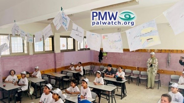 The picture shows drawings hanging in a classroom where children are sitting. On one of the drawings is written “Ibrahim Al-Nabulsi,” a terrorist who shot at Israeli soldiers, next to a small drawing of a rifle. On another drawing is written “Khader Adnan,” an Islamic Jihad terrorist who killed himself in a hunger strike. On another drawing is written “Shireen Abu Akleh,” a journalist who was shot and killed while covering a gun battle initiated by Palestinian terrorists.