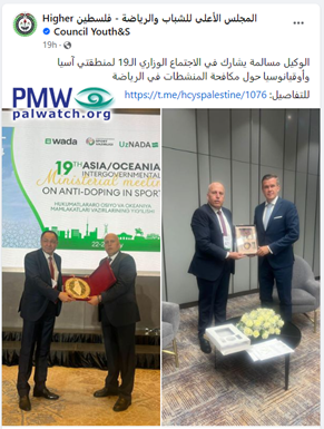 Posted text: “[PLO Supreme Council for Youth and Sports] Deputy [Chairman Mundhir] Masalmeh participates in the 19th Asia/Oceania [Intergovernmental] Ministerial Meeting on Anti-Doping in Sports.”