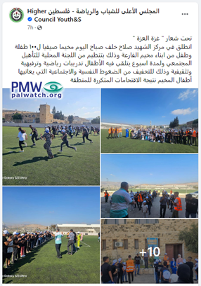 This morning [July 7, 2024] a summer camp opened at the Martyr Salah Khalaf Center (i.e., named after head of Black September terror organization) for 100 girls and boys of the Al-Fara’a refugee camp, which was organized by the local committee for community rehabilitation and [will last] for a week in which the children receive sports training, leisure, and education in order to ease the psychological and social pressures from which the children of the camp are suffering as a result of the recurring invasions of the area.”