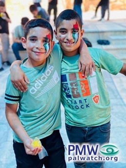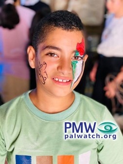 The images show children participating in the PLO Supreme Council of Youth and Sports summer camp. The children have the PA map of “Palestine” that presents all of Israel together with the PA areas as “Palestine” in the colors of the Palestinian flag drawn on their faces with face paint.