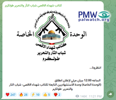 At 12:00 p.m. there will be a filmed statement on the launch of ‘the special unit’ – the Martyrdom-seeking unit of the Al-Aqsa Martyrs’ Brigades – Youth of Revenge and Liberation/Tulkarem”
