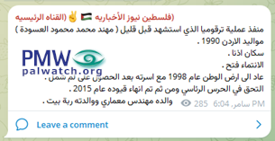 PMW has shown that members of the PA Security establishment often participate in terror and that the PA/Fatah takes pride in this. Terrorist murderer Al-Iswed was a former member of the PA Presidential Guard and this leads to concern as to the agenda, ideology, and teachings of said PA Security establishment.