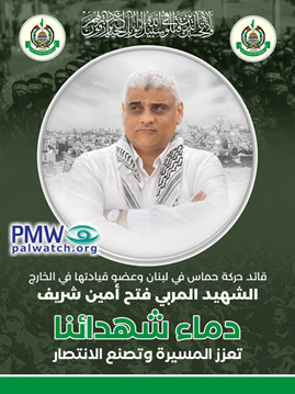 The image above shows a picture of Hamas leader in Lebanon and Chairman of the UNRWA Teachers' Union in Lebanon Fateh Sherif, who was killed in an Israeli airstrike. In the upper left and right corners is the Hamas logo.