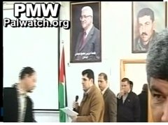 Seminar held in Qalqilya on the topic of "The Environmental Reality and the Occupation's Ongoing Attacks on It". Held in the Martyr (Shahid) Abu Ali Iyad Hall. On the wall, photographs of Chairman Abbas and of Abu Ali Iyad are displayed.Note: Abu Ali Iyad was appointed head of Fatah military operations in 1966, and was responsible for several terror attacks.