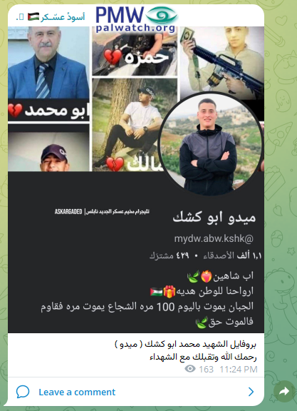 These words that a young terrorist put on his Telegram profile before he was killed fighting Israel are yet another example of how a brainwashed Palestinian is anxious to die heroically because he believes "death is a privilege."