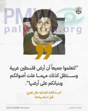 "Yesterday was the 47th anniversary of the Martyrdom of Palestinian fighter Dalal Mughrabi… She decided to join the ranks of the Palestinian revolution and to act in the ranks of the self-sacrificing fighters (i.e., terrorists) in the Fatah Movement while still a student. She took many military courses and received lessons in guerilla warfare, during which she trained with different weapons… She became known for her daring, her courage, her well-developed national sentiment, and for her devotion to Palestine and Fatah…