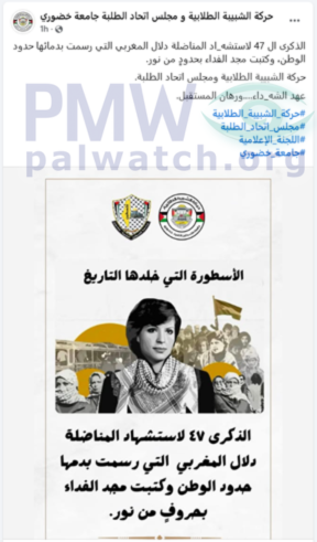 Fatah's student union about murderer Mughrabi: "Fighter Dalal Mughrabi outlined the borders of the homeland with her blood and wrote the praise of the self-sacrificing fighter with letters of light"