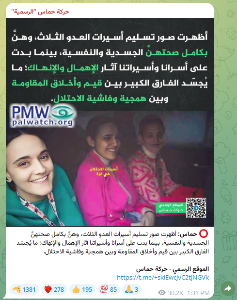 Text on picture and posted text: "The pictures of handing over the three female prisoners of the enemy (Israeli hostages – ed.) in full physical and mental health – while signs of weakening and negligence are noticeable on our male and female prisoners (released terrorists – ed.) – show the large gap between the morality and values of the [Hamas] resistance, and the brutality and fascism of the occupation (i.e., Israel)."