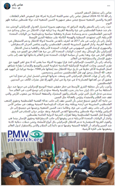 Fatah Central Committee member and [Fatah] General Commissioner for Arab and China Relations Abbas Zaki received Chinese Ambassador in the State of Palestine Zeng Jixin… and briefed them about the cruel Israeli aggression… with military support and aid and political and diplomatic cover from the US, which is striving to achieve comprehensive control and hegemony in the Middle East region.