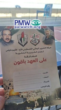 PA educational institutions also mark the day of Abu Jihad's death. Fatah's Shabiba High School Movement arranged a "cultural competition" called "Remaining Loyal to the Path" at schools in Nablus. The top of the competition registration form features a picture of terrorist Abu Jihad and a picture of former PLO and PA Chairman Yasser Arafat, making it clear that students are being encouraged to remain loyal to their path of terror: