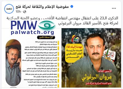 Posted text: "On the 23rd anniversary of his arrest, Fatah: Prisoner leader Marwan Barghouti is a shining example on the path of the Palestinian struggle and an awe-inspiring symbol for our people