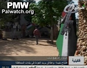 This map was broadcast on PA TV News. The map includes all of Israel and the Palestinian areas covered in the Palestinian flag with a key on top, symbolizing Palestinian political sovereignty over the entire area.