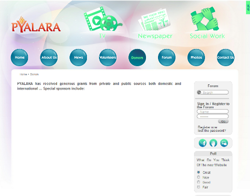 PMW reported that PYALARA listed the European Commission Humanitarian Aid Office, Save the Children UK and Cordaid as funders. Currently, all that remains on the donor page is this sentence: