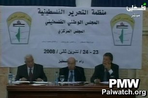 Two maps including all of Israel displayed under the Palestinian flag, symbolizing Palestinian sovereignty over the land. This image is from a PLO central committee meeting in 2008. PA Chairman Mahmoud Abbas is sittnig on the left.