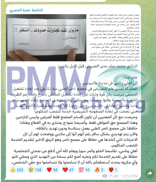 In a Telegram post in April 2025 shown below, the hospital's director of Nursing Services showed a note in which he was "threatened blatantly" by Islamic Jihad for trying to prevent the organization from entrenching itself there: "Sweetie: You crossed the line – just wait! This is the first message. Al-Quds Brigades."