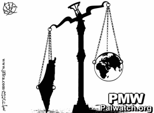 A map including all of Israel is shown being weighed on a scale against the world. The map of Israel and the PA areas outweighs the world. This cartoon sends the message that Palestine is more important than the entire world.