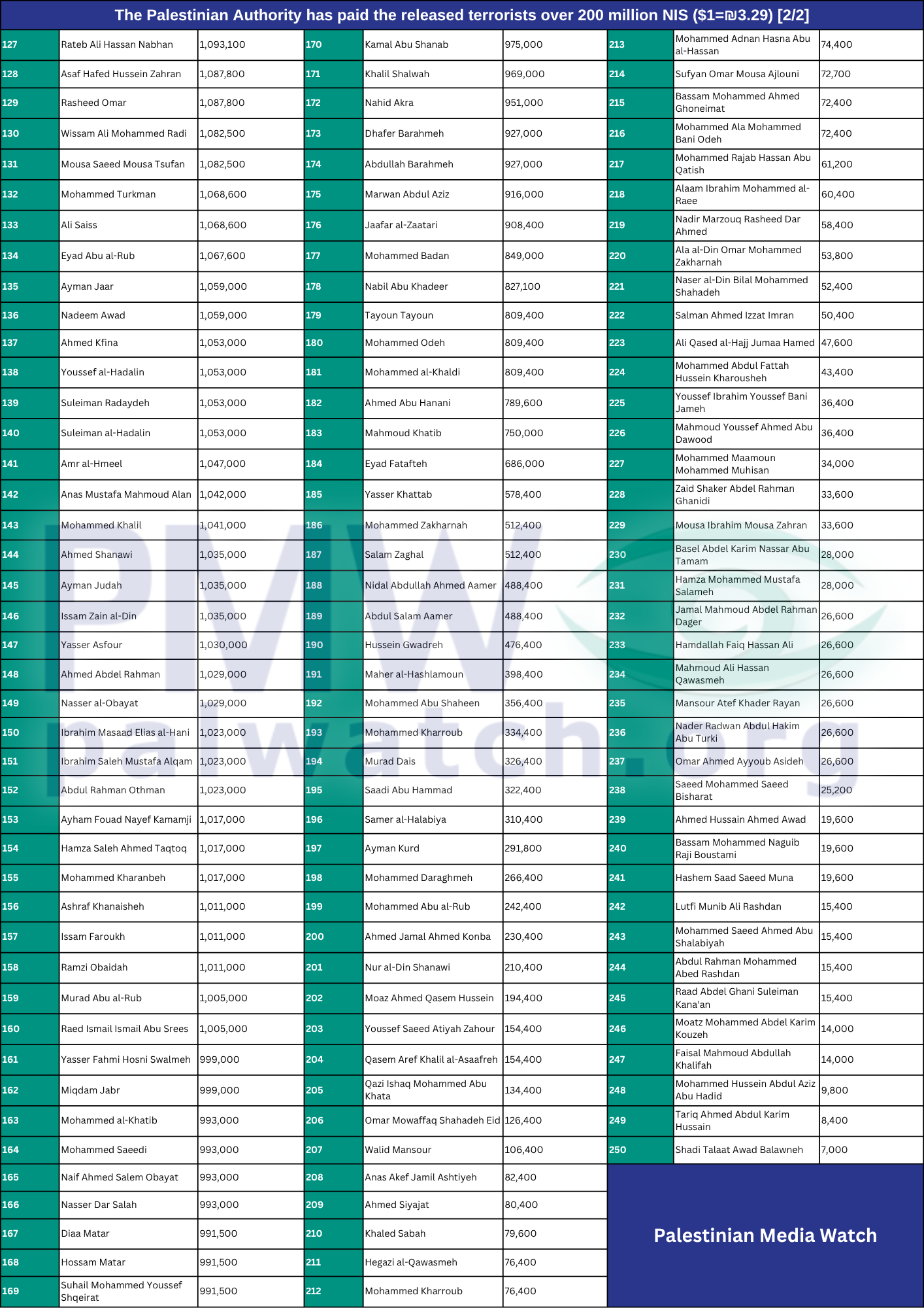 The following charts have the names of all the freed terrorists and how much money the PA has paid them: