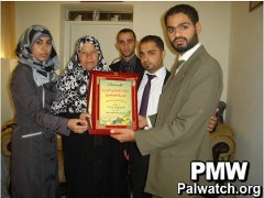 "Yesterday, the Arab Lawyers Union honored the family of martyred lawyer Hanadi Jaradat (i.e., suicide terrorist) from the city of Jenin, marking the ninth anniversary of her death as a Martyr, during a visit by a delegation representing the union to the family's home. The visiting delegation awarded a plaque from the Arab Lawyers Union to honor the family of Martyr Jaradat, who died a Martyr's death on Oct. 4, 2003, in an operation (i.e., terror attack) during which 19 Israelis were killed and about 50 injured. Member of the Palestine Committee of the Arab Lawyers Union, Ayman Abu Aysha, said that the honoring of the family of Martyr Jaradat came in the wake of a decision taken by the Palestine Committee of the Arab Lawyers Union during a meeting held in Cairo on Sept. 8, 2012. The delegation, which included Khatam Al-Hih, Muhammad Alan, Muhammad Halaweh, and Adi Alawi, conveyed to the family of Martyr Jaradat the good wishes of the head of the Union, Mr. Omar Al-Zayn, and of the head of the Palestine Committee in the Union, Mr. Said Abd Al-Ghani, and also emphasized the pride of the Arab Lawyers Union for what their daughter had done in defense of Palestine and the nation. Deputy Secretary of the Arab Lawyers Union, Said Abd Al-Ghani, said that the Union created the "Martyr Hanadi Jaradat plaque of honor," the highest honor awarded by the Union in esteem for any [female] lawyer in the Arab homeland."