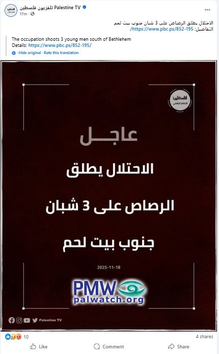 Posted text, 2:37 PM: [Video from the scene of the attack with caption]: "From the location of the occupation's shooting of 3 young people south of Bethlehem"