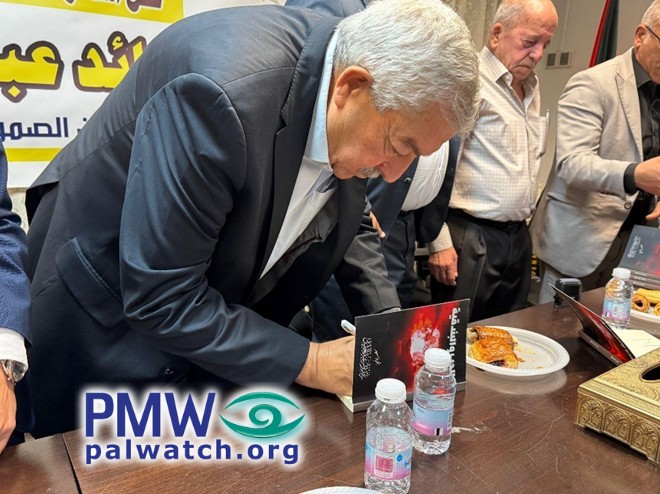 Fatah Deputy Chairman Mahmoud Al-Aloul signed the book "Love and a Rifle" by released terrorist prisoner Raed Abd Al-Jalil. The book is about released terrorist prisoner Rami Nour, who murdered 1 person.