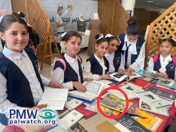 Young Palestinian children are also fed a diet of violence and terror promotion. At the National Book Fair organized by the PA Ministry of Culture at the Arab American University in Jenin, young schoolgirls read books written by terrorist prisoners at a booth in which the PLO Commission of Prisoners' Affairs "presented the literary and intellectual works" of terrorists and released terrorists. One book cover in the center of the table pictured below features a picture of terrorist Marwan Barghouti, who orchestrated three attacks in which 5 people were murdered: