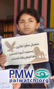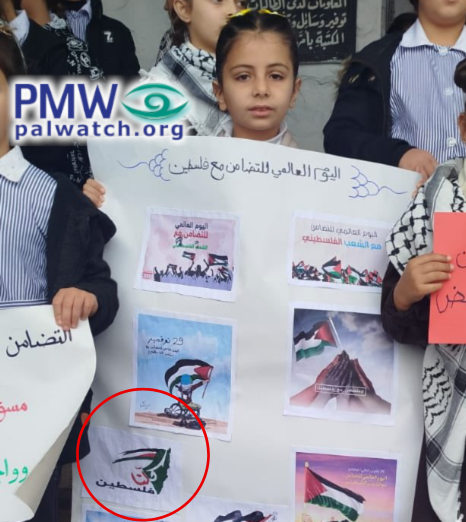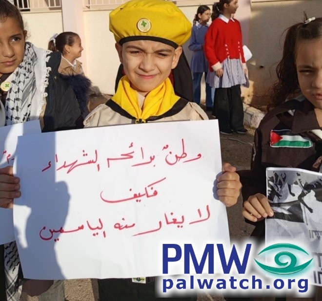 This child abuse was once again highlighted this week during celebrations of the UN's "International Day of Solidarity with the Palestinian People." The Tulkarem Directorate of Education proudly posted photos on Facebook taken at the school events of children holding signs glorifying Martyrdom. One sign portrayed Martyrs as smelling sweeter than a jasmine flower: