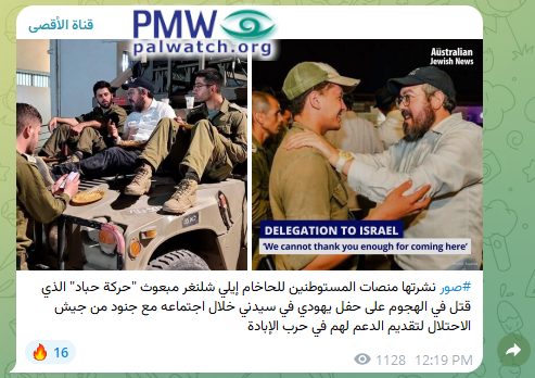 Posted text: "Pictures published on the pages of settlers of Rabbi Eli Schlanger, an emissary of the Chabad Movement who was killed [on Dec. 14, 2025] in an attack on a Jewish [Hanukkah] celebration in Sydney at a time when he was meeting with soldiers from the occupation (i.e., Israeli) army in order to assist them in the war of annihilation."