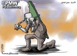 This cartoon shows a Palestinian prisoner carrying the weight of “Palestine” on his shoulders. The map includes both Israeli and Palestinian territories.