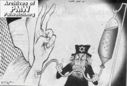 Published when Arafat was sick in hospital, two weeks before his death, this cartoon shows a demonized Jew chewing through Arafat's IV line as he signals “V” for peace. This cartoon, accusing Israel of trying to kill Arafat, was published in the official PA daily, Al-Hayat Al-Jadida.» View analysis citing this item