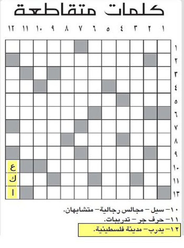 | Clue: "A Palestinian city" Solution: "Tel Aviv" [Al-Hayat Al-Jadida, Jan. 26, 2011] | Clue: "A Palestinian city" Solution: "Tel Aviv" Clue: "A Palestinian city" Solution: "Tiberias" Clue: "A Palestinian city" Solution: "Jaffa" [Al-Hayat Al-Jadida, Feb. 20, 2011] |