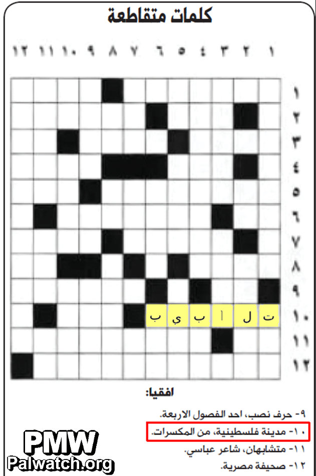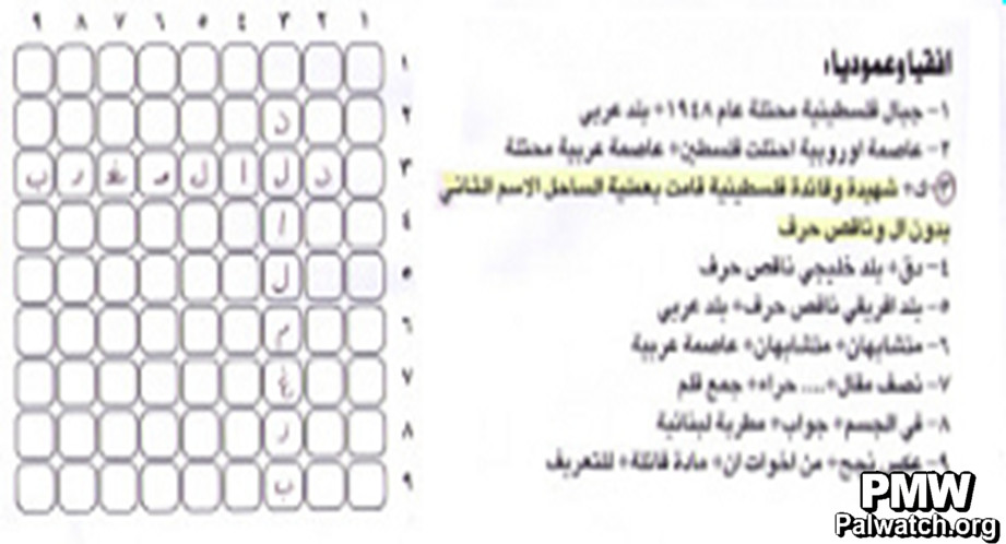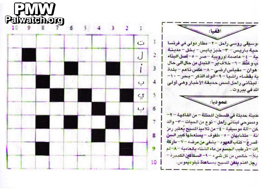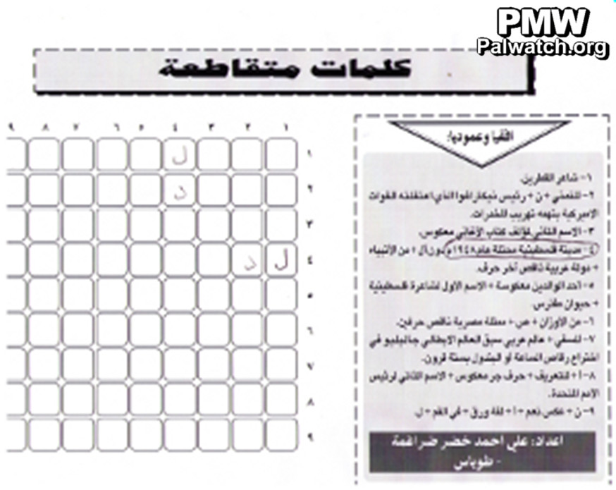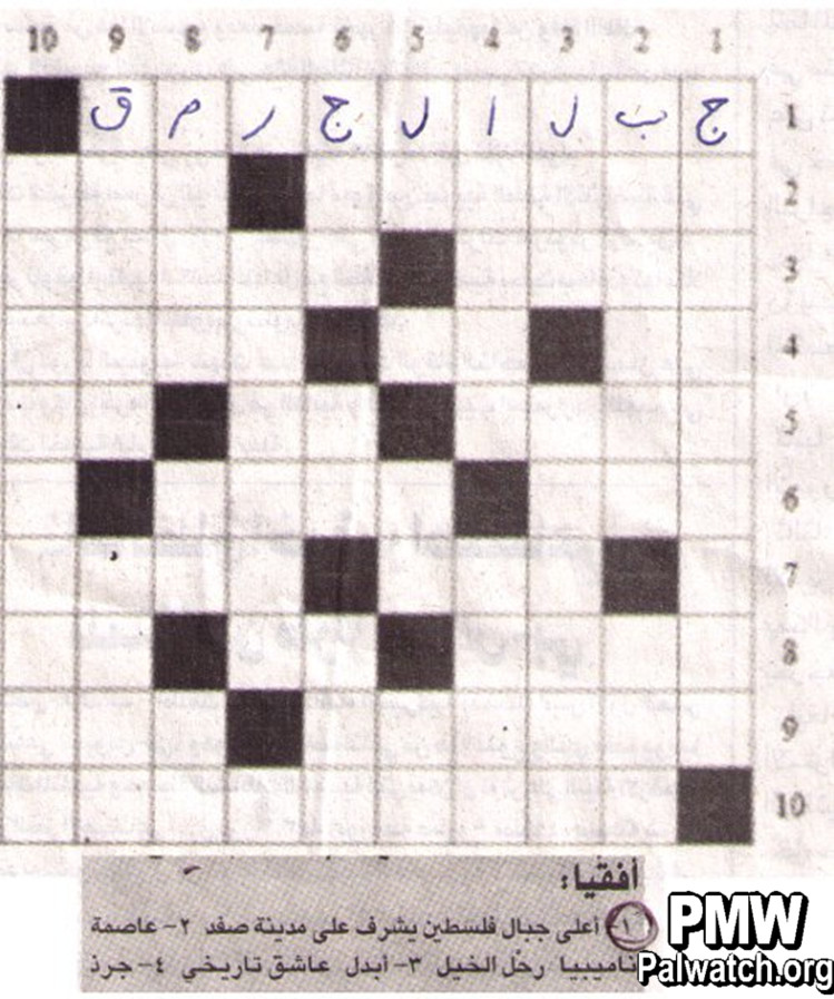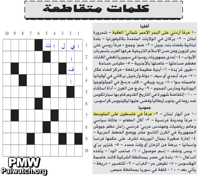 With its crossword clues, the official PA paper continues the PA policy of denying Israel's existence.
