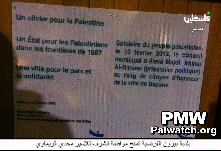 Palestinian Authority TV News: French city grants "honorary citizenship" to terrorist prisoner