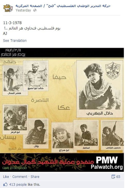 Fatah’s official Facebook page glorified terrorist Dalal Mughrabi and the anniversary of the most lethal terror attack in Israel’s history. 37 Israeli civilians were killed when Dalal Mughrabi and a group of terrorists hijacked a bus on March 11, 1978. “March 11, 1978, Palestinian Fatah day that shook the world!”
